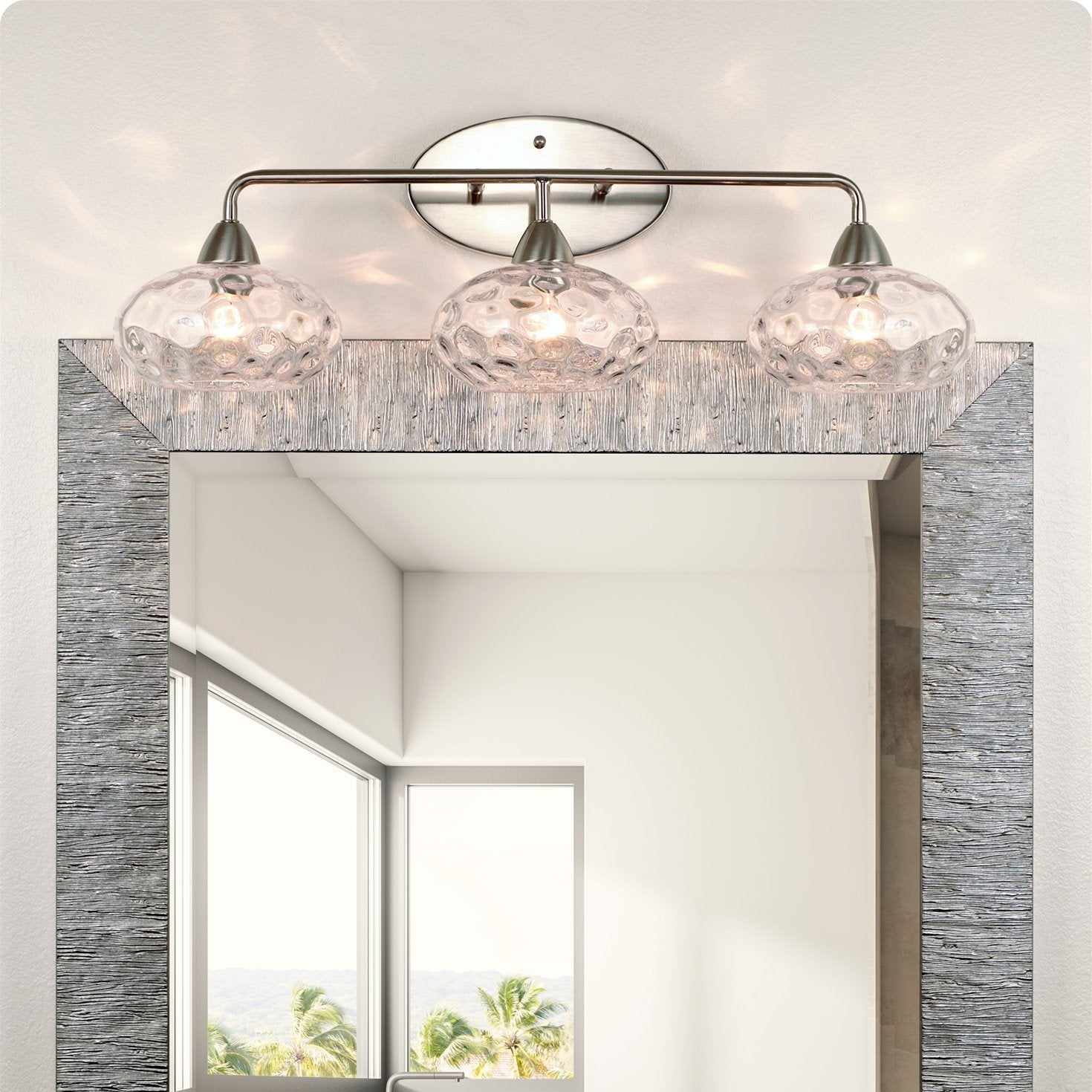 The Marina Vanity Light boasts a one of a kind design that is both attractive and versatile. The hammered glass shades are hand blown, conveying a custom look and feel. Paired with a beautiful brushed nickel finish, this 3 light vanity fixture is a standout piece. Additionally, details like the oval shaped shades and clean curved arm design, lend distinctive style to this triple sconce. Install up or down to your preference. Mount above the bathroom mirror, over a kitchen or laundry sink or in a powder room. Crafted with quality materials, it suits hospitality settings like restaurants or bars. Both delicate in appearance and durable and construction, add Marina to a wide range of interior styles and decors from rustic and farmhouse to modern, transitional and traditional. Unlike many of our competitors, this wall light is dimmable and UL Listed for your safety. At Kira Home, we pride ourselves on exceptional customer service! That is why we provide a 3-year warranty for Marina. We confidently stand behind our quality products but understand issues may occur once in a while, such as damage in transit or defects. Rest assured, we will resolve these issues. Please contact us via email so we can assist you on any necessary replacements or refunds.